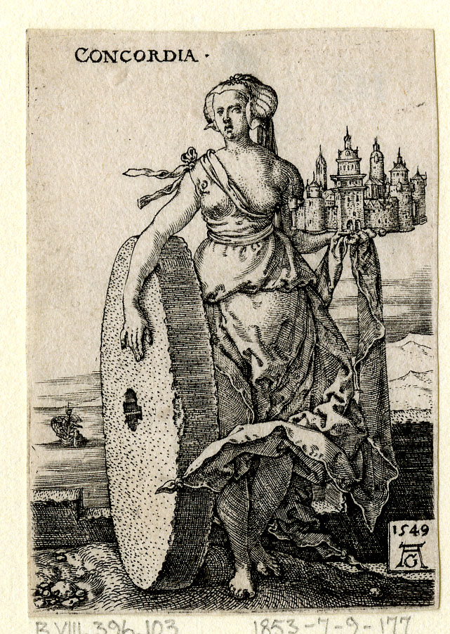 Concordia holds the model of a walled city in her left hand and a millstone in her right. The millstone suggests how the grinding of many grains together creates a single flour, to feed and nourish the peaceable city and its its harmonious citizens.Engraving by Heinrich Aldegrever from a series of whole-length personifications of the virtues and vices with their respective attributes. (1549) British Museum 1853,0709.177